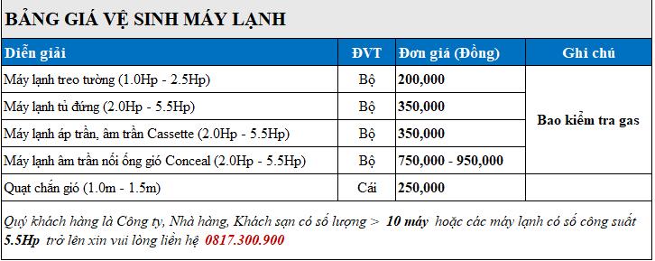 - Khung giá trên là gói dịch vụ vệ sinh bảo trì máy lạnh (điều hoà nhiệt độ). Chỉ áp dụng cho các máy đang hoạt động và đang làm lạnh bình thường.
