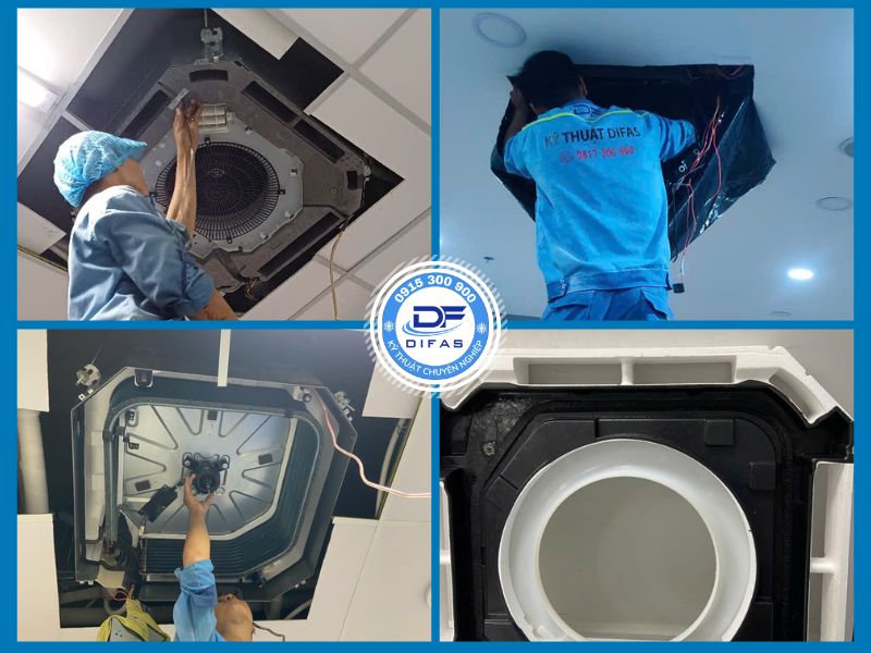 Bước 5: Lần lượt lắp lại các bộ phận đã tháo rời của dàn lạnh âm trần như máng nước ngưng tụ, giắc cắm bo mạch, lưới lọc, mặt nạ,…