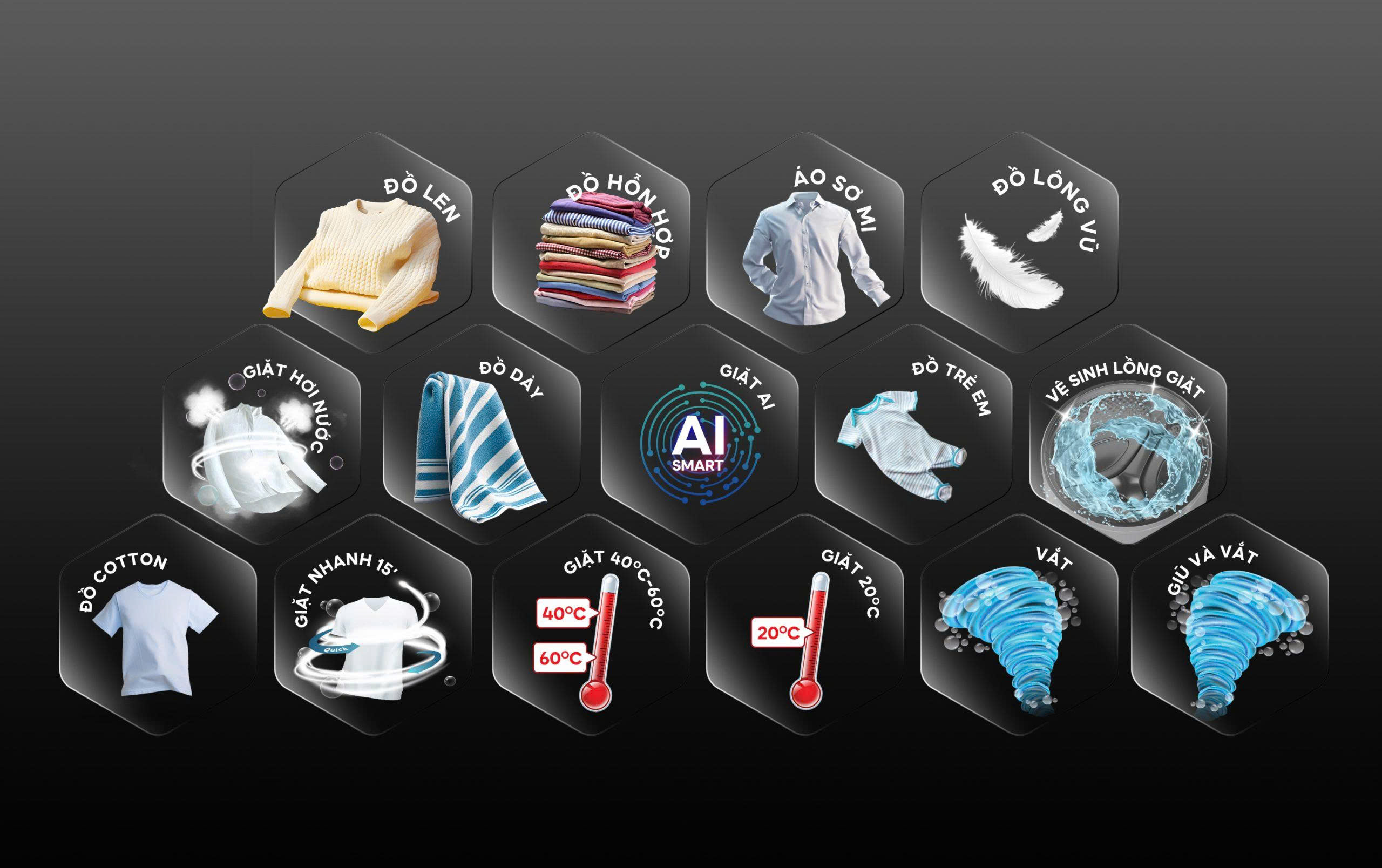 Giặt thông minh AI Smart sử dụng 6 cảm biến để tối ưu hóa quá trình giặt, tự động điều chỉnh và cải thiện hiệu quả giặt, đồng thời bảo vệ quần áo.