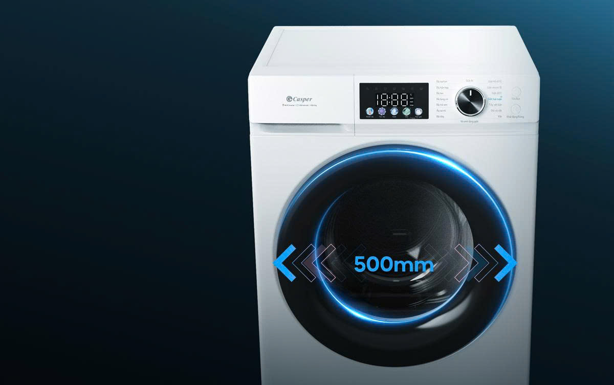 Thiết kế cửa lồng giặt lên tới 500mm phù hợp với nhu cầu giặt đồ khối lượng lớn, giúp mọi thành viên trong gia đình thao tác thuận tiện, dễ dàng, cho dù là quần áo dày nặng hay chăn ga gối cồng kềnh.