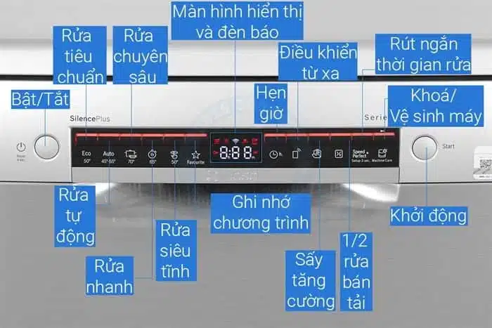 – Machine Care: chức năng giúp đánh bay các cặn bẩn, mảng bám bên trong máy rửa chén để không gian trong máy luôn sạch sẽ, bảo vệ chén bát của bạn khỏi sự tấn công của vi khuẩn có hại.